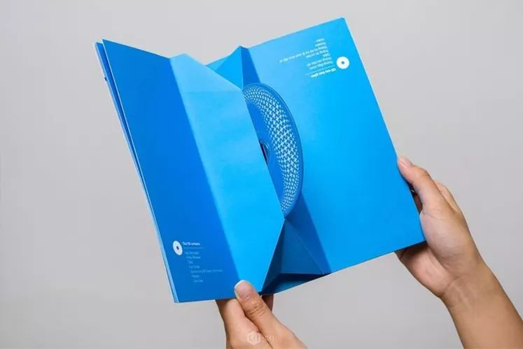 如果您计划在您的小册子中包含实物项目(无论是CD,DVD还是类似的东西),可以以有趣的方式展示它。你并不局限于把它放在一个简单的唱片套后面。在这里,CD会弹出来,邀请你去接受它。弹出的形状使内部有维度,否则显得很平。