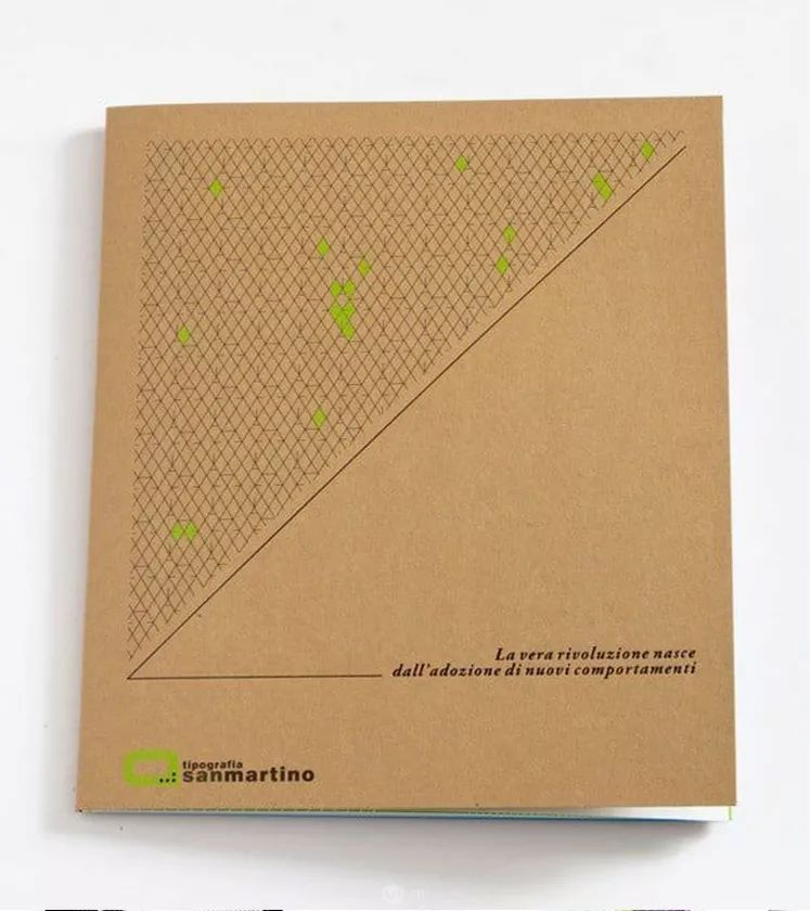 根据画册的用途,使用的材料可以很好地联系起来。可回收的材料使您的企业看起来更加环保和“绿色”,而更多的工业给了一个完全不同的,蓝领的感觉。在这里,再生纸与明亮的绿色搭配在一起给了这本小册子一个非常朴实的感觉。